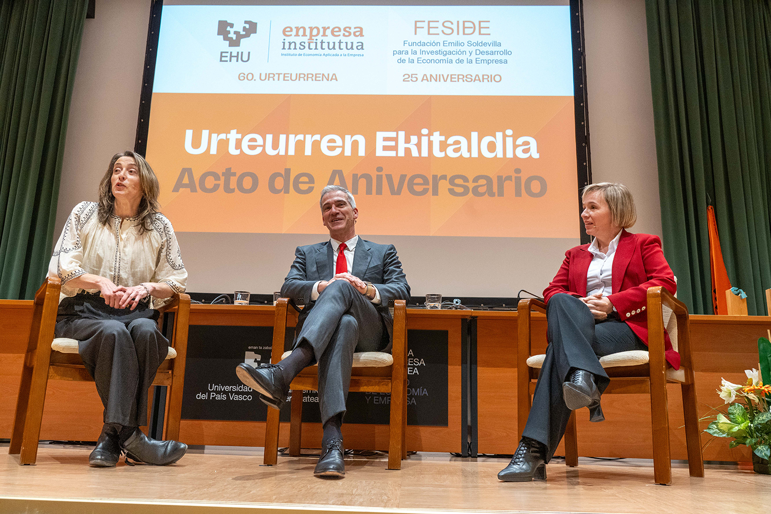 El pasado 13 de marzo, en el Aula Magna de la Facultad de Economía y Empresa de la EHU (Sarriko) se celebró un acto conjunto con motivo del 60.º aniversario del Enpresa Institutua y el 25. de la Fundación Emilio Soldevilla para la Investigación y el Desarrollo de la Economía de la Empresa (FESIDE). La cita estuvo presidida por el rector de EHU, Joxerramon Bengoetxea, y con la participación de altos representantes institucionales, reunirá a los ámbitos académico, institucional y empresarial.